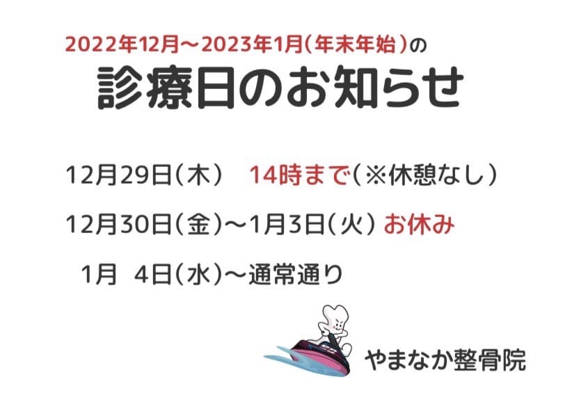 【🎍年末年始の診療日のお知らせ⛄️】 上記の通り 29日 お昼休み無しの14時まで 30日~3日 休診 4日 通常診療 となります😆✨